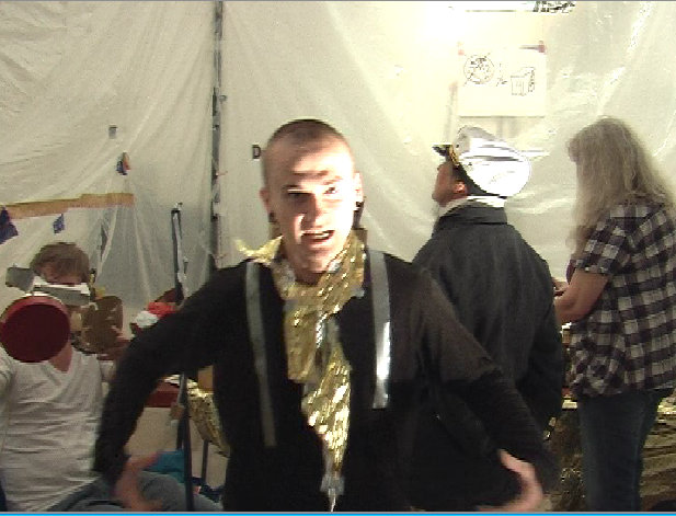 (Von Leiter springender Arbeiter: Balthasar Röger, entgegenrennender Arbeiter mit Halstuch: Anja Klafki, Aufseher im Hintergrund: Steffi Reling, wegrennender Arbeiter: Dörthe Jakobs, Animation Schwungrad: Cosima Schuba)