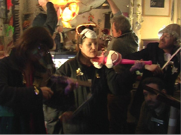 (Rechter Steward am Gitter: Jörg Buchmann, Passagiere auf der Treppe: Kurt Grunow, Stephan Köperl mit Guibal-Weibertreupaar, U!!i Berg, Marc Olbrich, Sylvia Winkler mit Daniela-Wolff-Psychiatriegartentasse und Seherin von Prevorst)