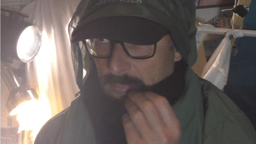 | sich Schal und Kapuze überziehender "Cyrus": Joachim Peter, Animation sich öffnende Knastvogelheckklappe und Sandsturm: Peter Haury