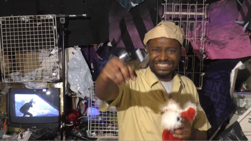 | erschöpfte "Aufseher Bishop" im Käfig: Amelie Pyta, Animation Käfigpolster: Donate Kluxen-Pyta