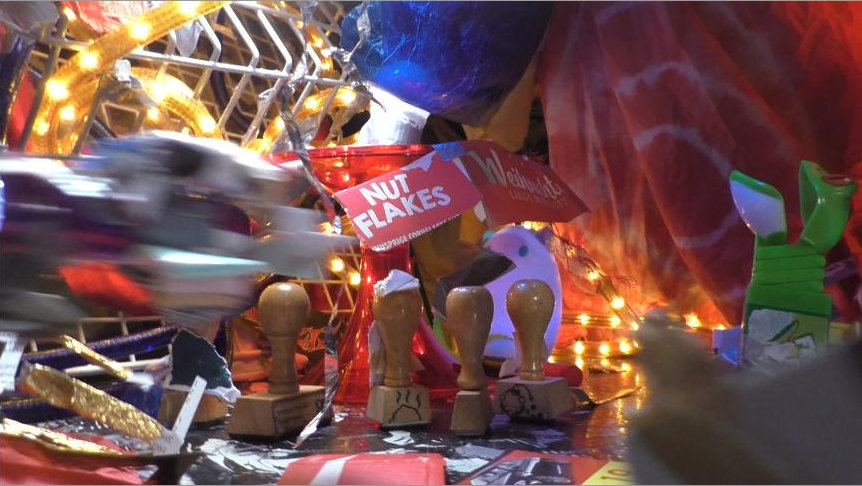 | Animation durch Brettergerüst auf Förderband fallendes "Cyrus"-püppchen: Jan Müller