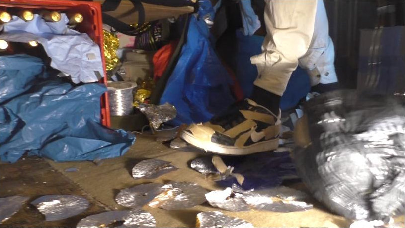 | aus Bodenluke des Knastvogels spähender "Cyrus": Coline Petit, Beine mehrerer Feuerwehrleute und Animation Funkenregen: Josephine Kremberg, Animation Blaulichtgewitter, Warnleuchte und Funkenregen: Johannes Wünsch, Animation Blaulichtgewitter rechts: Fabian Baldszun