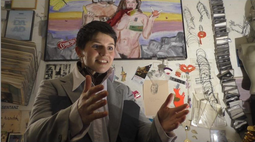 ("Dr. Lull": Hiltrud Henn, im Hintergrund Matrix 62b-37 aus Ampullenkoffer heraus suchender "Bernie": Leonie Henn, Animation Außerirdisches-Katalog-Monitor: Weiyan Wang, Animation Außerirdisches-Katalog-Blättern im Monitor: Peter Haury)