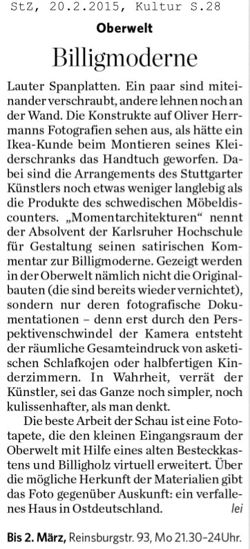 Der simple Titel der Ausstellung P2V20 - stellt eine Industriekennzeichnung für Spanplatten im Möbelbau dar. Dieses Material thematisiert Oliver Herrmann in der Architektur des Raumes als Wand füllende Fotografie, im Aufbau als Installation und mit kleinformatigen Arbeiten.