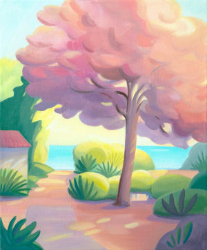 zudem ein durchgängig warmer, pastellartiger Farbklang, der den Werken zunächst eine angenehme, beruhigende Atmosphäre verleiht – zugleich jedoch die subtile Künstlichkeit der dargestellten Landschaften betont. Reinhardts Bildsprache operiert mit stilisierten, abstrahierten Formen und integriert Einflüsse der Pop Art. Elemente aus Comic und Trickfilm weisen darauf hin, dass Landschaft hier als kulturelles Konstrukt verstanden wird, verortet im Spannungsfeld zwischen