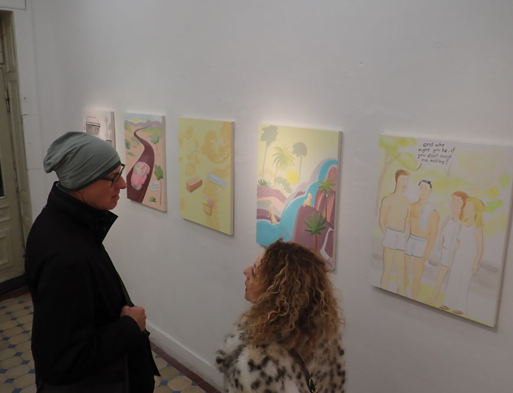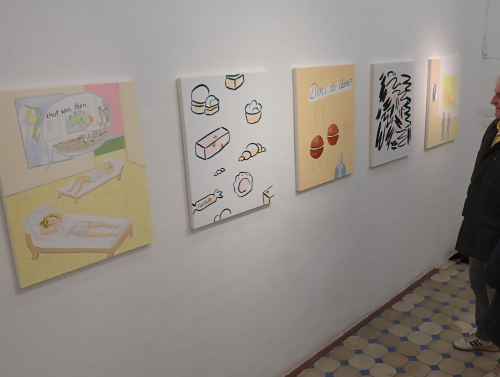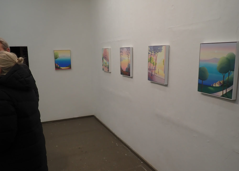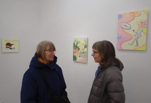 In den neuen Acrylarbeiten, die parallel zu den Landschaftsbildern präsentiert werden, knüpft Reinhardt an diese Bildsprache an. Es handelt sich um illustrativ erzählte kurze Szenen, die – einem Cartoon oder einer Karikatur vergleichbar – bereits auf den ersten Blick zugänglich erscheinen. Wie in den Landschaften herrscht eine heitere, freche Grundstimmung, die den Werken ihren unverwechselbaren Ton verleiht.