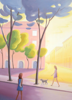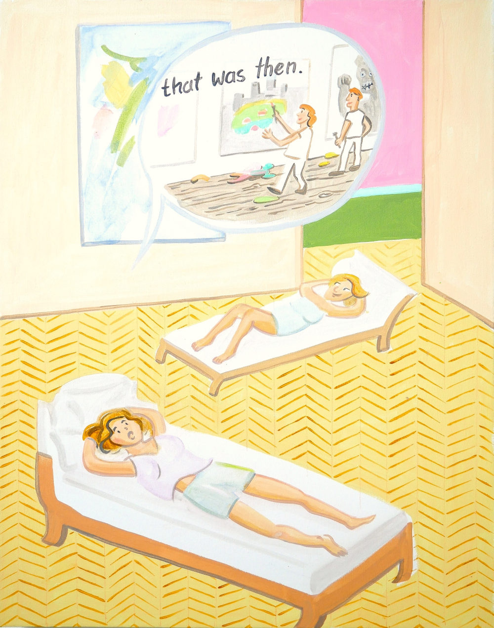 In den neuen Acrylarbeiten, die parallel zu den Landschaftsbildern präsentiert werden, knüpft Reinhardt an diese Bildsprache an. Es handelt sich um illustrativ erzählte kurze Szenen, die – einem Cartoon oder einer Karikatur vergleichbar – bereits auf den ersten Blick zugänglich erscheinen. Wie in den Landschaften herrscht eine heitere, freche Grundstimmung, die den Werken ihren unverwechselbaren Ton verleiht.
